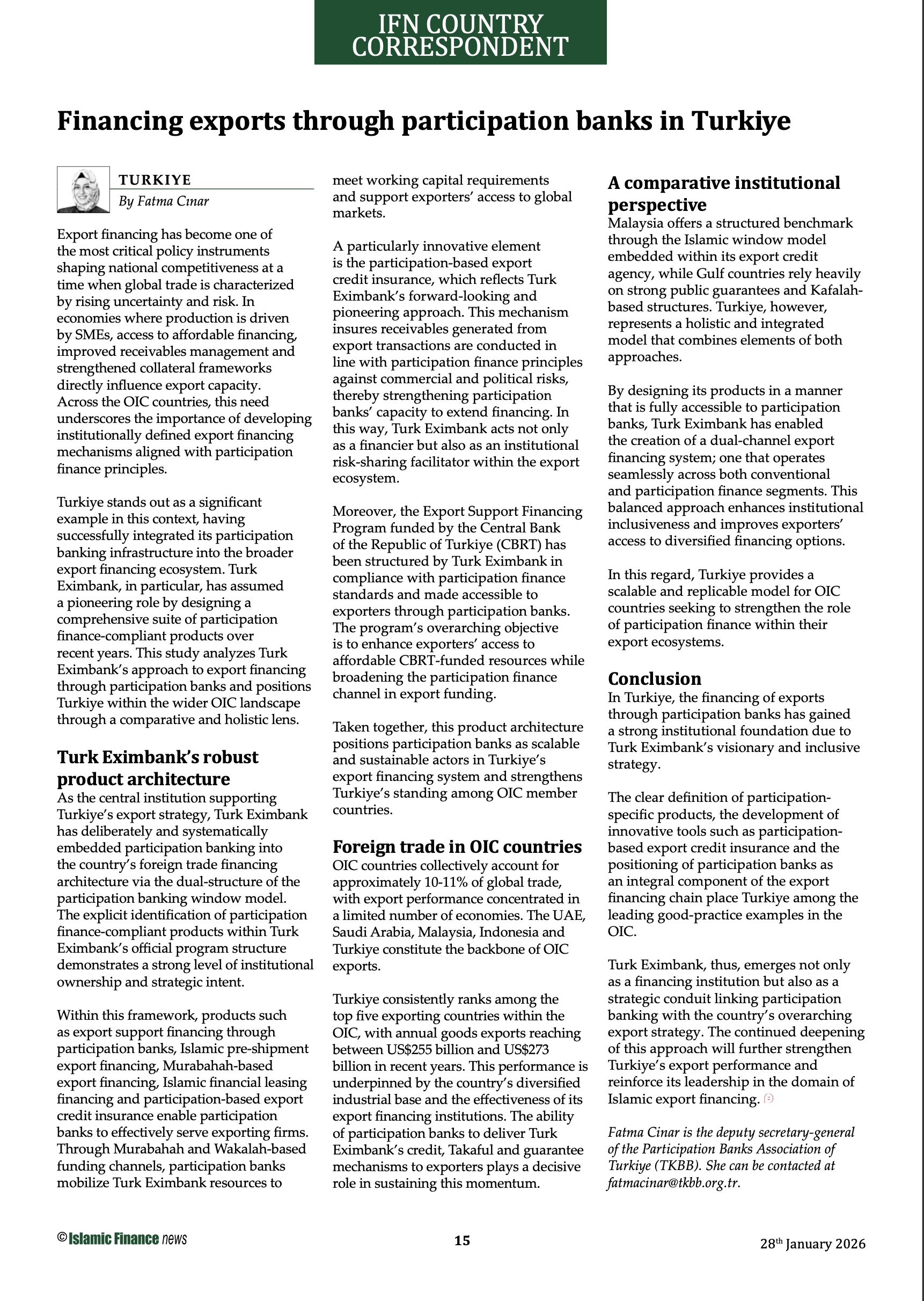 Export financing has become one of the most critical policy instruments shaping national competitiveness at a time when global trade is characterized by rising uncertainty and risk. In economies where production is driven by SMEs, access to affordable financing, improved receivables management and strengthened collateral frameworks directly influence export capacity. Across the Organization of Islamic Cooperation (OIC) countries, this need underscores the importance of developing institutionally defined export financing mechanisms aligned with participation finance principles. Türkiye stands out as a significant example in this context, having successfully integrated its participation banking infrastructure into the broader export financing ecosystem. Türk Eximbank, in particular, has assumed a pioneering role by designing a comprehensive suite of participation finance — compliant products over recent years. This study analyzes Türk Eximbank’s approach to export financing through participation banks and positions Türkiye within the wider OIC landscape through a comparative and holistic lens.